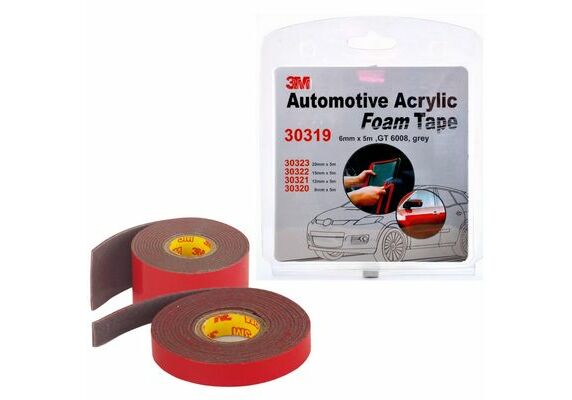 Двусторонняя клейкая акриловая лента компании 3M представляет собой ленту серого цвета из вспененного акрилового клея с красным пластиковым лайнером.