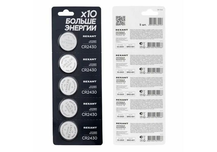 Элемент питания (батарейка) CR2430 3В блистер 5 шт. REXANT /391109