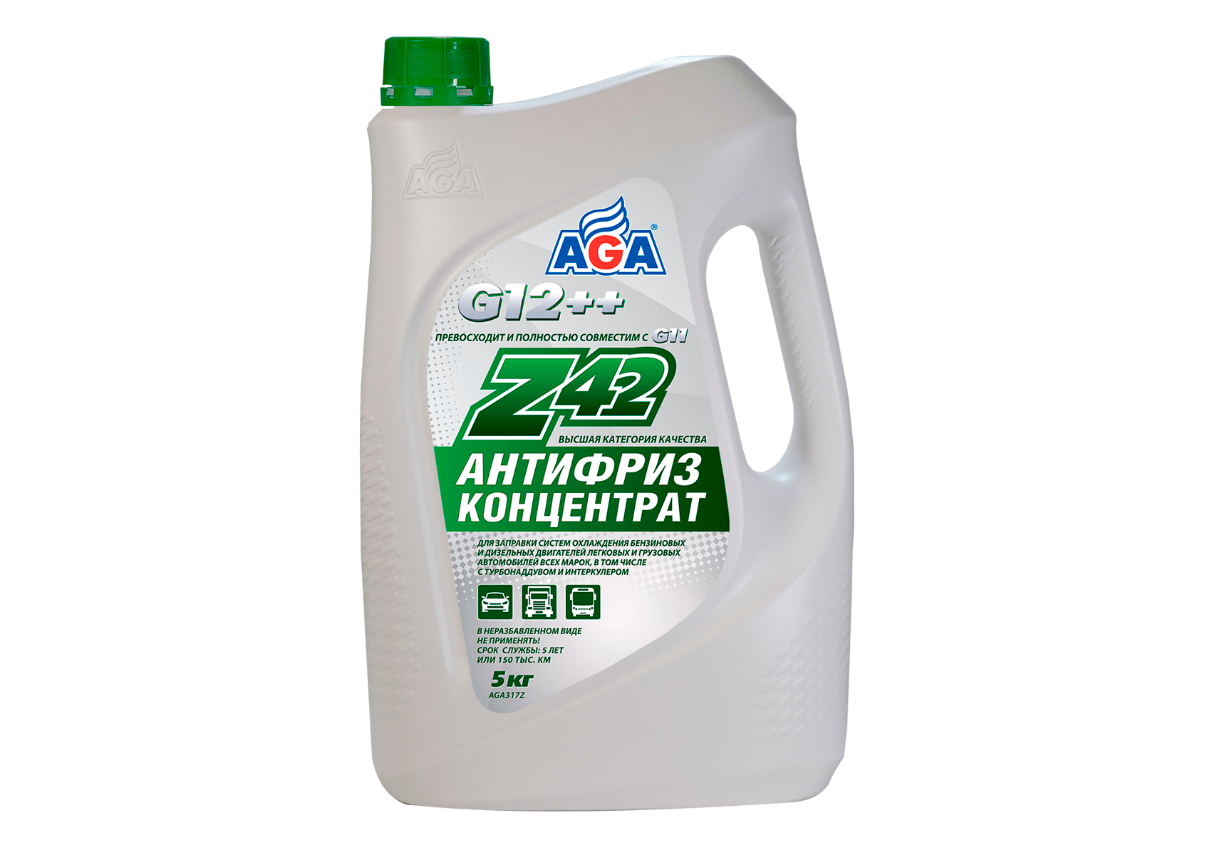 Концентрат для приготовления универсального автомобильного антифриза высшей категории качества AGA-Z42. Предназначен (после разбавления водой) для заправки систем охлаждения бензиновых и дизельных двигателей легковых и грузовых автомобилей всех марок, а также автобусов. Идеален для высокофорсированных двигателей, работающих в тяжелых динамических условиях с частым выходом на высокие обороты коленвала (более 4000 об/мин).