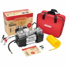 2-поршневой компрессор повышенной мощности с зажимами на АКБ. Оборудован дополнительным быстросъемным шлангом с манометром. 2 цилиндра диаметром 40мм;...