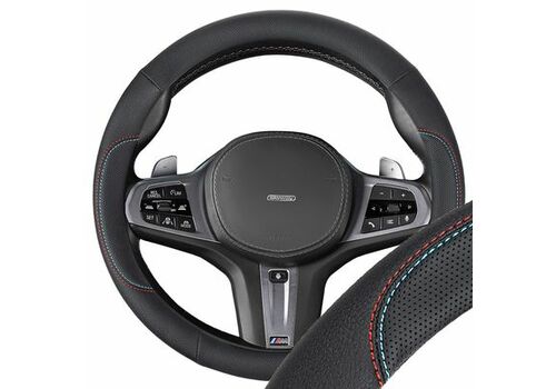 Оплетка экокожа M (37-39 см) SKYWAY Design Bavaria-2 Черная, красная/синяя строчка - стильный аксессуар сохранит руль вашего автомобиля от повреждений, скроет имеющиеся царапины и трещины. Создаст атмосферу уюта в салоне автомобиля, добавит комфорта во время вождения и подчеркнет индивидуальность владельца. Оплетка выполнена из качественной экокожи. Благородная прострочка дополняет красивую отделку. Внутренний слой из поливинилхлорида надежно фиксирует оплетку, исключая ее проскальзывание. В производстве TM SKYWAY используются только качественные, экологически чистые материалы. Аккуратно выполненные и прочные швы - гарантия высокой долговечности. Экокожа проста в уходе, изностойкая, не нагревается на солнце, в холодную погоду приятная на ощупь.