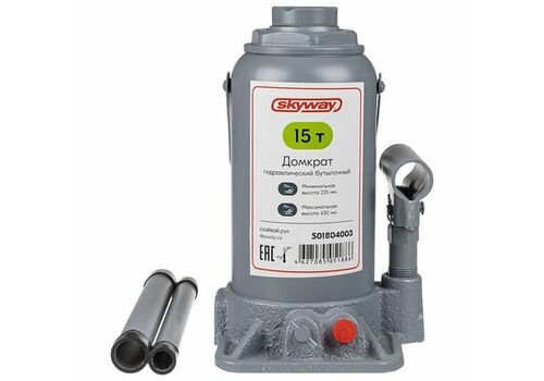 Домкрат гидравлический бутылочный 15 т h 225-430 мм SKYWAY с клапаном в коробке+сумка - полностью металлическая конструкция узлов и агрегатов обеспечивает высокую надежность и отказоустойчивость. Перепускной клапан предохраняет домкрат от поломки, если вес груза превышает грузоподъемность домкрата.