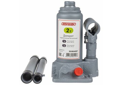 Домкрат гидравлический бутылочный 2 т h 148-278мм SKYWAY с клапаном в коробке+сумка - полностью металлическая конструкция узлов и агрегатов обеспечивает высокую надежность и отказоустойчивость. Перепускной клапан предохраняет домкрат от поломки, если вес груза превышает грузоподъемность домкрата.