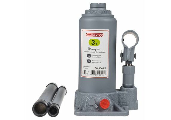 Домкрат гидравлический бутылочный 3 т h 175-345мм SKYWAY с клапаном в коробке+сумка - полностью металлическая конструкция узлов и агрегатов обеспечивает высокую надежность и отказоустойчивость. Перепускной клапан предохраняет домкрат от поломки, если вес груза превышает грузоподъемность домкрата.