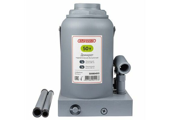 Домкрат гидравлический бутылочный 50 т h 285-465 мм SKYWAY с клапаном в коробке - полностью металлическая конструкция узлов и агрегатов обеспечивает высокую надежность и отказоустойчивость. Перепускной клапан предохраняет домкрат от поломки, если вес груза превышает грузоподъемность домкрата.
