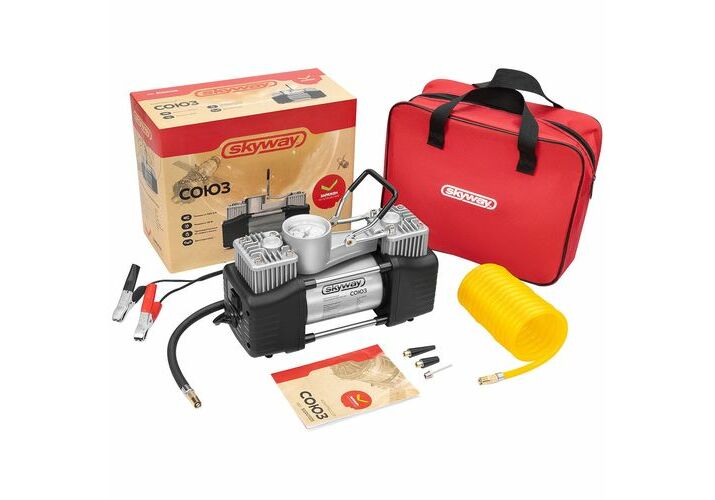 Компрессор металлический 60л/мин с крокодилами SKYWAY СОЮЗ 2х поршневой в сумке 10 АТМ - устройство, предназначенное для поддержания и регулирования давления воздуха в шинах с максимальным давлением 10 Атм, работающий от АКБ 12 V.