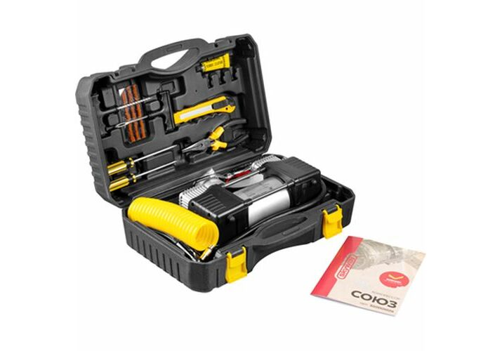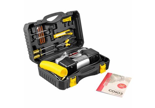 Корпус металлический с удобной ручкой для переноски. Компрессор оснащен манометром. В комплекте 3 насадки для накачивания резиновых мячей, игрушек и лодок. Набор для ремонта бескамерных шин и инструменты для ремонта. Также в наборе присутствует переходник для подключения компрессора напрямую к АКБ. Пластиковый кейс обеспечивает удобное хранение и транспортировку.