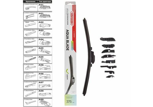 Щетка стеклоочистителя бескаркасная SKYWAY AQUA BLADE 9 адаптеров в коробке 38см/15"- подходят для любого автомобиля и обеспечивают равномерное очищение всей поверхности лобового стекла. Щетки технологически усовершенствованы, и удаляют даже самые маленькие частицы пыли и воды. Натуральный каучук, графитовое напыление, которые использованы в производстве щеток, позволяют значительно снизить уровень шума и увеличить срок службы. Под воздействием температурных изменений резина щетки остается эластичной(и даже при контакте с реагентами). Щетка плотно прилегает к поверхности стекла.