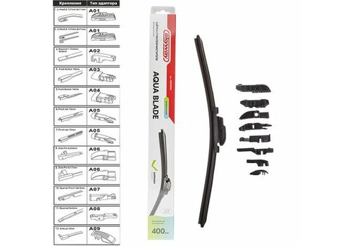 Щетка стеклоочистителя бескаркасная SKYWAY AQUA BLADE 9 адаптеров в коробке 40см/16"- подходят для любого автомобиля и обеспечивают равномерное очищение всей поверхности лобового стекла. Щетки технологически усовершенствованы, и удаляют даже самые маленькие частицы пыли и воды. Натуральный каучук, графитовое напыление, которые использованы в производстве щеток, позволяют значительно снизить уровень шума и увеличить срок службы. Под воздействием температурных изменений резина щетки остается эластичной(и даже при контакте с реагентами). Щетка плотно прилегает к поверхности стекла.