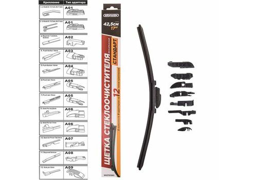 Щетка стеклоочистителя бескаркасная SKYWAY AQUA BLADE 9 адаптеров в коробке 43см/17"- подходят для любого автомобиля и обеспечивают равномерное очищение всей поверхности лобового стекла. Щетки технологически усовершенствованы, и удаляют даже самые маленькие частицы пыли и воды. Натуральный каучук, графитовое напыление, которые использованы в производстве щеток, позволяют значительно снизить уровень шума и увеличить срок службы. Под воздействием температурных изменений резина щетки остается эластичной(и даже при контакте с реагентами). Щетка плотно прилегает к поверхности стекла.