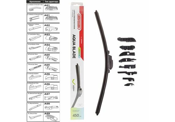Щетка стеклоочистителя бескаркасная SKYWAY AQUA BLADE 9 адаптеров в коробке 45см/18"- подходят для любого автомобиля и обеспечивают равномерное очищение всей поверхности лобового стекла. Щетки технологически усовершенствованы, и удаляют даже самые маленькие частицы пыли и воды. Натуральный каучук, графитовое напыление, которые использованы в производстве щеток, позволяют значительно снизить уровень шума и увеличить срок службы. Под воздействием температурных изменений резина щетки остается эластичной(и даже при контакте с реагентами). Щетка плотно прилегает к поверхности стекла.