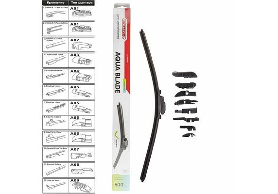 Щетка стеклоочистителя бескаркасная SKYWAY AQUA BLADE 9 адаптеров в коробке 50см/20"- подходят для любого автомобиля и обеспечивают равномерное очищение всей поверхности лобового стекла. Щетки технологически усовершенствованы, и удаляют даже самые маленькие частицы пыли и воды. Натуральный каучук, графитовое напыление, которые использованы в производстве щеток, позволяют значительно снизить уровень шума и увеличить срок службы. Под воздействием температурных изменений резина щетки остается эластичной(и даже при контакте с реагентами). Щетка плотно прилегает к поверхности стекла.