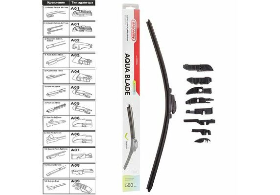 Щетка стеклоочистителя бескаркасная SKYWAY AQUA BLADE 9 адаптеров в коробке 55см/22" - подходят для любого автомобиля и обеспечивают равномерное очищение всей поверхности лобового стекла. Щетки технологически усовершенствованы, и удаляют даже самые маленькие частицы пыли и воды. Натуральный каучук, графитовое напыление, которые использованы в производстве щеток, позволяют значительно снизить уровень шума и увеличить срок службы. Под воздействием температурных изменений резина щетки остается эластичной(и даже при контакте с реагентами). Щетка плотно прилегает к поверхности стекла.