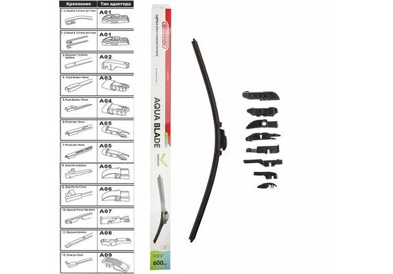 Щетка стеклоочистителя бескаркасная SKYWAY AQUA BLADE 9 адаптеров в коробке 60см/24"- подходят для любого автомобиля и обеспечивают равномерное очищение всей поверхности лобового стекла. Щетки технологически усовершенствованы, и удаляют даже самые маленькие частицы пыли и воды. Натуральный каучук, графитовое напыление, которые использованы в производстве щеток, позволяют значительно снизить уровень шума и увеличить срок службы. Под воздействием температурных изменений резина щетки остается эластичной(и даже при контакте с реагентами). Щетка плотно прилегает к поверхности стекла.