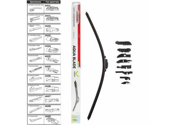 Щетка стеклоочистителя бескаркасная SKYWAY AQUA BLADE 9 адаптеров в коробке 70см/28"- подходят для любого автомобиля и обеспечивают равномерное очищение всей поверхности лобового стекла. Щетки технологически усовершенствованы, и удаляют даже самые маленькие частицы пыли и воды. Натуральный каучук, графитовое напыление, которые использованы в производстве щеток, позволяют значительно снизить уровень шума и увеличить срок службы. Под воздействием температурных изменений резина щетки остается эластичной(и даже при контакте с реагентами). Щетка плотно прилегает к поверхности стекла.