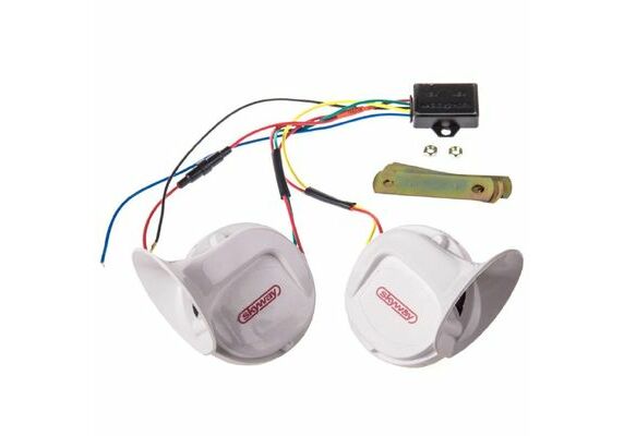 Сигнал звуковой УЛИТКА SKYWAY 017 мощный 18 мелодий d=3D90мм 12V 105dB сталь/пластик Белый 2 шт 2-контактный + реле - мощный электрический звуковой сигнал. Имеет необычную форму улитки и 18 разных мелодий. Уровня громкости до 105 дБ - этого хватает, чтобы обозначить себя на дороге и повысить безопасность в пути или на парковке. Используйте звуковой сигнал на любом автомобиле. Питание 12В. Установить сигнал можно в штатное (стандартное) место или в качестве тюнинга авто. Диаметр каждой улитки 90 мм, в комплекте 2 шт.