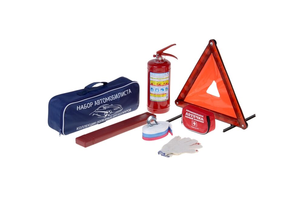 В наборе перчатки, огнетушитель ОП-2 с манометром, аптечка, трос буксировочный 5т. 2 крюка, малый аварийный знак.